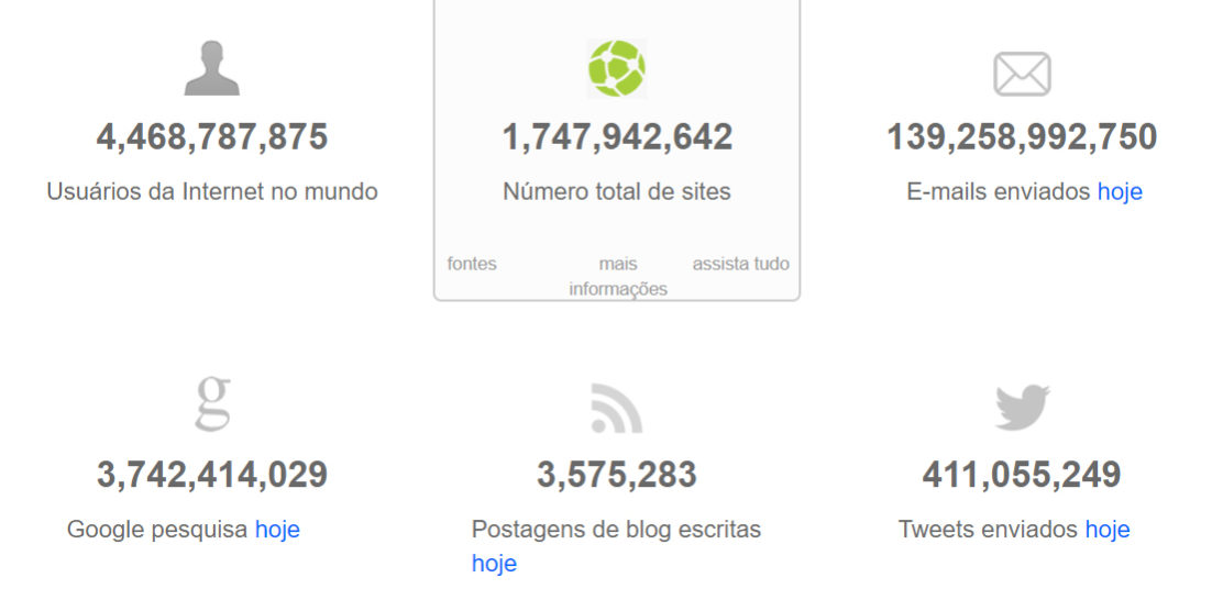 Você sabe quantos sites existem no mundo? Pode chutar um número… pensa bem… entre blogs, sites institucionais, portfólios, loja virtuais, cada dia nascem milhares de sites de diferentes tipos, tamanhos e designs. Como eu sei disso? Pelo Internet Live Stats, uma página que mostra em tempo real quantos sites estão ativos na internet.